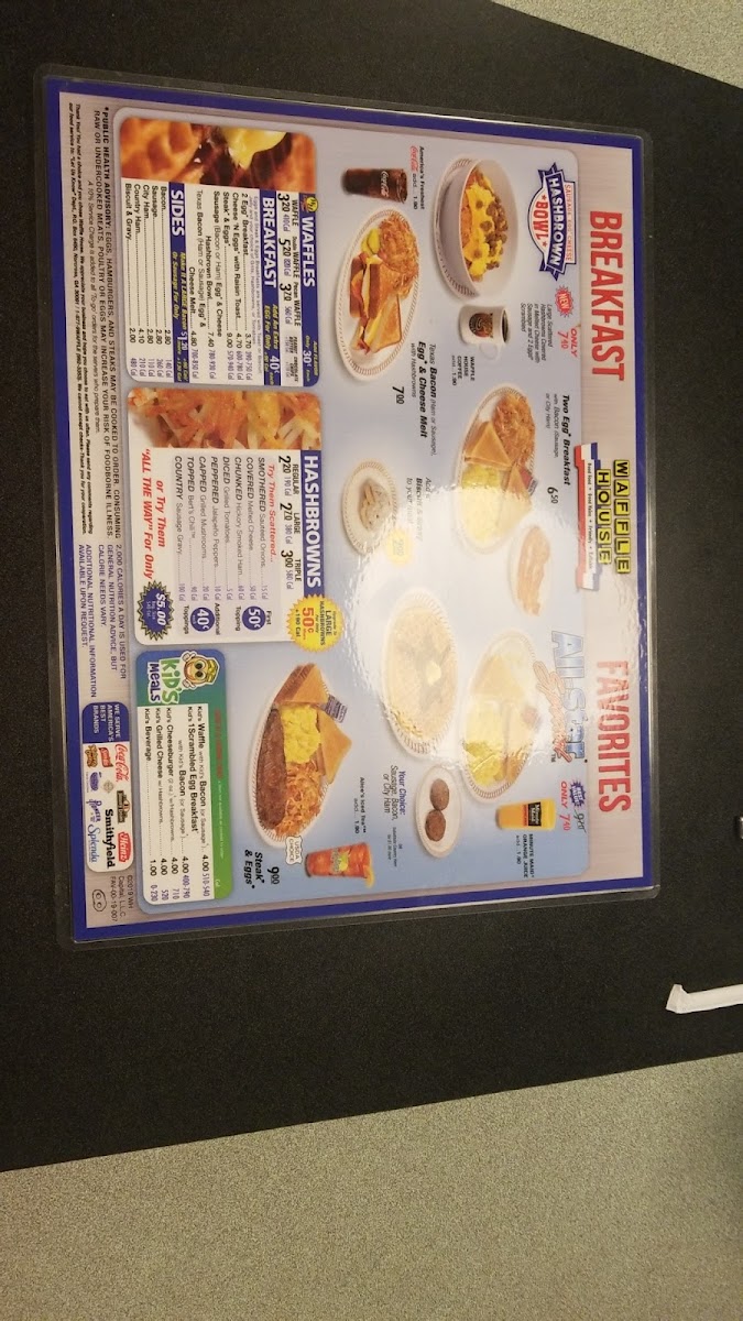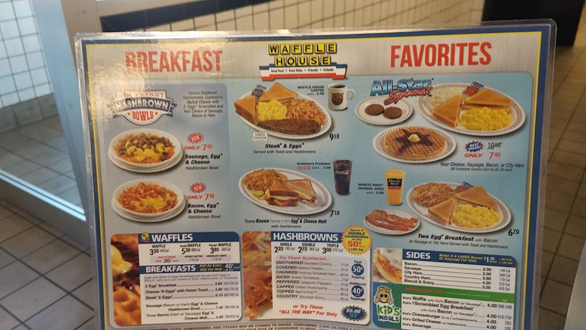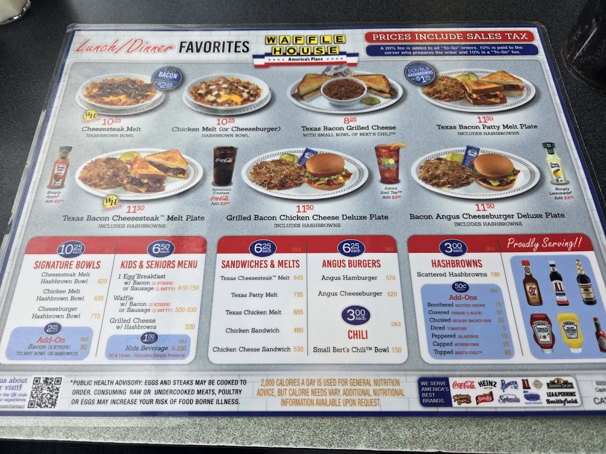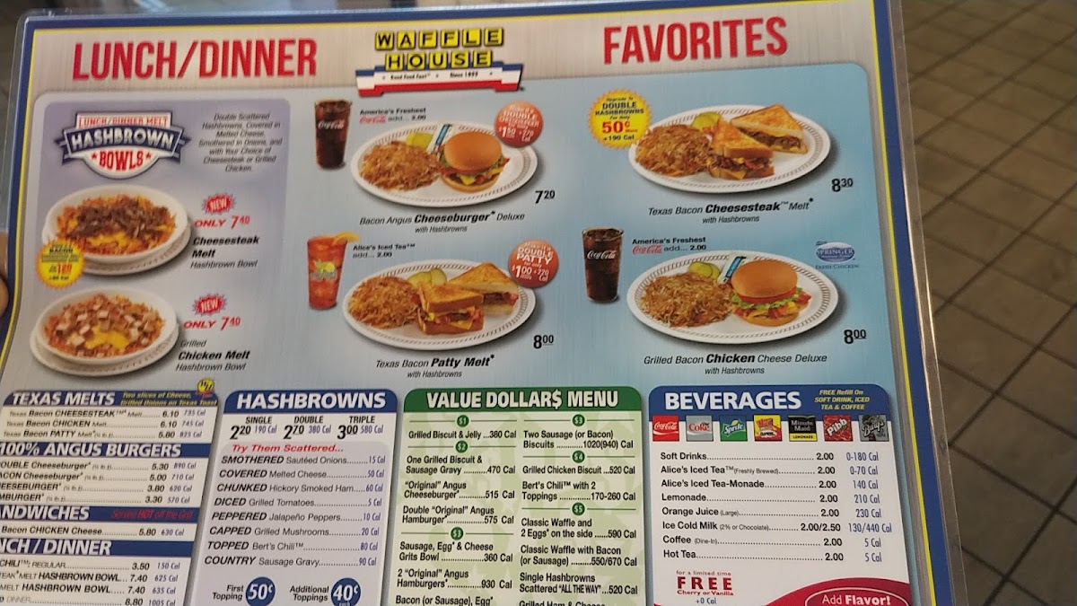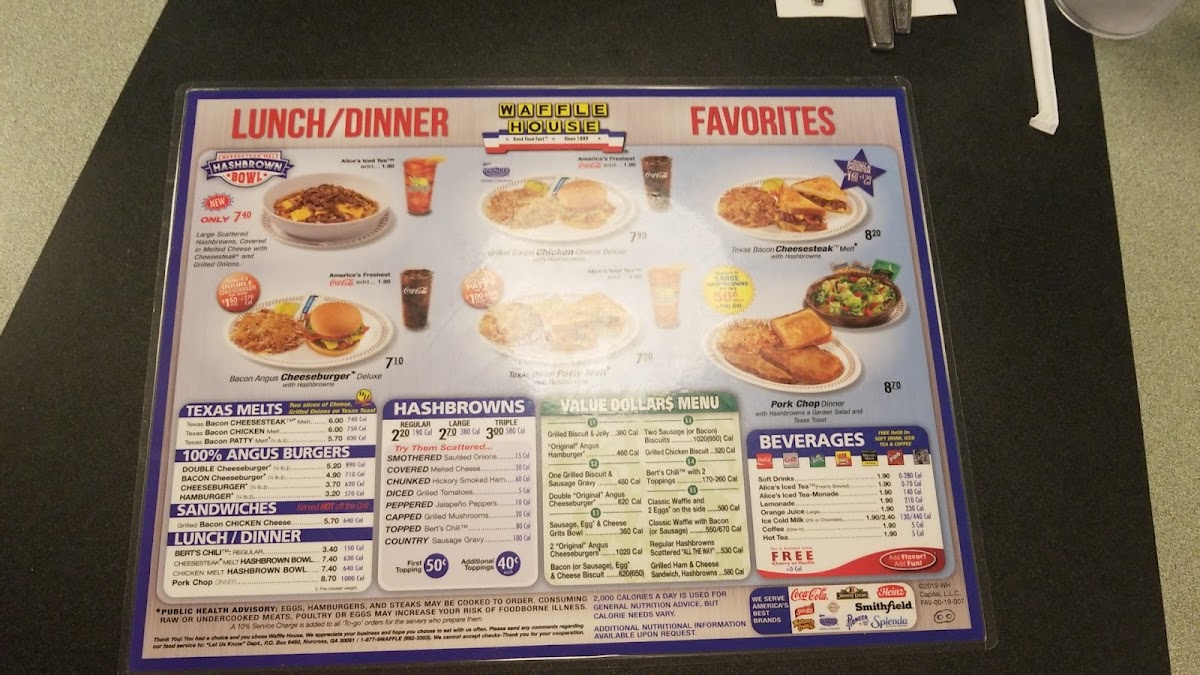 The menu also boasts standout protein options like the grilled Springer Mountain Farms® chicken breast and the tender, flavorful pork chop. Regulars praise Waffle House for fast, consistent service and comforting dishes like hash browns, Philly cheese steak bowls, and delectable pecan or apple pie for dessert. This menu embodies classic diner charm, making every visit feel like home.
